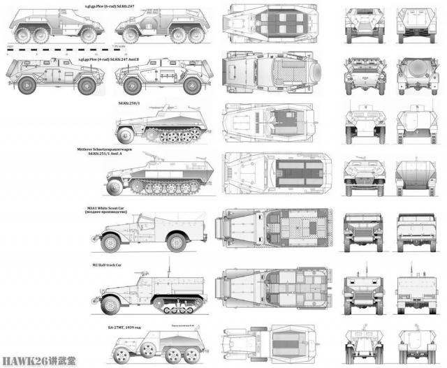 二战期间的几款装甲车辆,注意顶部的 Sd.Kfz.247 和 Sd.Kfz.247 Ausf.B。